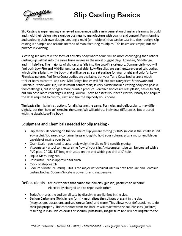 Technique & Information Sheets Georgies offers custom firing services for cone 04 bisque, plus glaze firing for cone 05 and cone 6. The form below can be printed for your reference. We load/unload throughout the weeek ... we have a 7-10 "business day" turnaround ... we will do our best to get your work back to you as soon as possible. Bring your pieces in with the name of the clay body and the temperature range that you want us to fire your work. We load on a first come-first serve basis, so bring your work in at your convenience. We will call you when your work is ready to pick up. -- Please print and fill out the In-Take Form below when you bring in your firing -- .You can always call us if you have any questions at 503-283-1353. Click on the images for a PDF to print