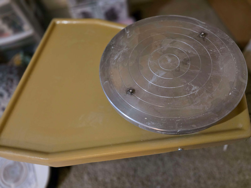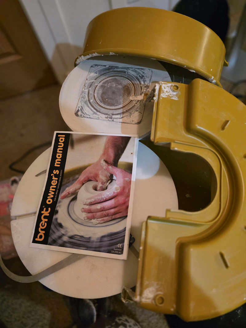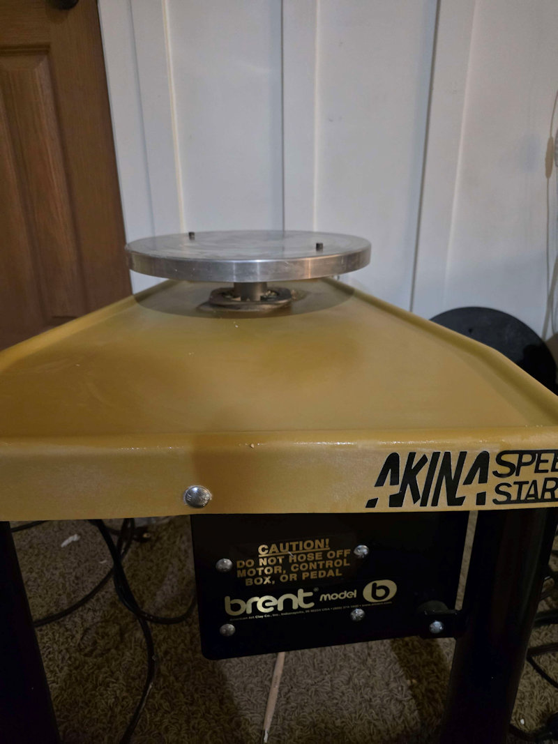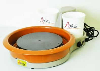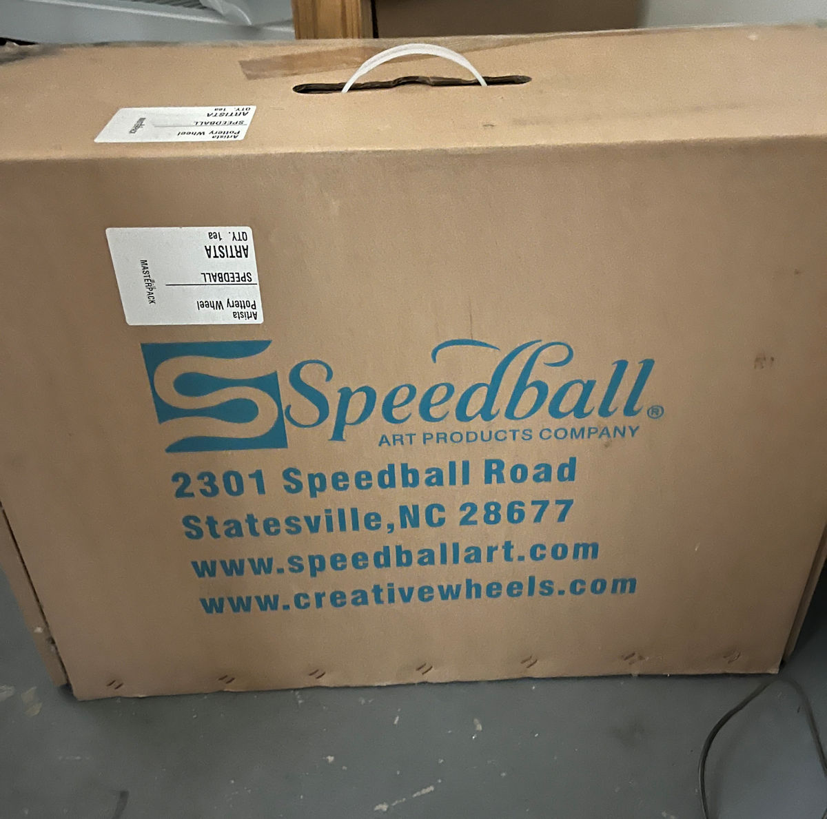 Still in it's box, a Master Pack Artista Potters Wheel! Portable and easy to store. 25lb centering capacity with an 11 wheel head. 1/3 HP motor that runs smoothly with very little noise. Variable speed hand control (0-220 rpm) and two-part splash pan. Also includes 2 bats (7.5" & 12").Can be converted to foot-powered with Speedball's plug-in foot pedal (not included).
